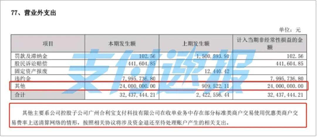 子公司聯(lián)動優(yōu)勢在收單業(yè)務(wù)中存在部分標(biāo)準(zhǔn)類商戶交易使用商戶交易費率上送清算網(wǎng)絡(luò)的情形,公司按照相關(guān)協(xié)議將涉及資金分批退還至待處理賬戶,基于謹(jǐn)慎性原則,公司將所涉及資金計入營業(yè)外支出。公告中,營業(yè)外支出的其他金額為58,655,047.10元