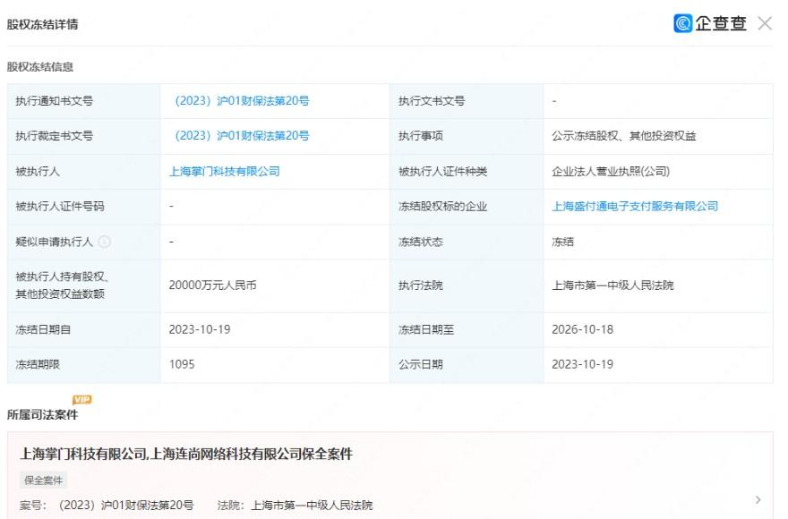 日前,據(jù)公開信息,案號為“(2023)滬01財保法第20號”的信息顯示,支付機構(gòu)上海盛付通電子支付服務有限公司(簡稱“盛付通”)有2億元數(shù)額的股權(quán)被凍結(jié)。被執(zhí)行人為盛付通的控股股東上海掌門科技有限公司(簡稱“掌門科技”),執(zhí)行法院系上海市第一中級人民法院,凍結(jié)期限自2023年10月19日至2026年10月18日。