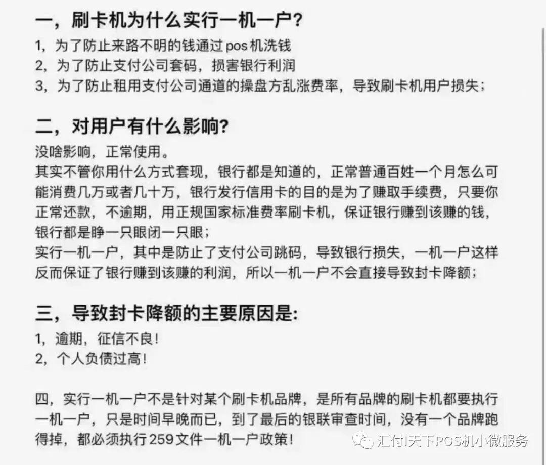 所以一機一戶解決辦法持卡人必須要多備兩臺穩(wěn)定靠譜的POS機。等子彈多飛一會兒,看看發(fā)卡行是否改變風(fēng)控規(guī)則。畢竟壞賬太多也不是發(fā)卡行愿意看到的,畢竟全國來說需要養(yǎng)卡TX生存的人體量較大影響人們的基本生活。