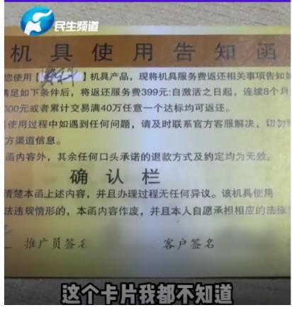 業(yè)務(wù)員全部辦理完后給了陳女士一張卡片,陳女士表示這張卡片上面說的根本不明白,簽名什么的我也不知道。最關(guān)鍵的是陳女士要辦的是信用卡,根本不是POS機(jī),結(jié)果信用卡壓根沒有辦下來。
