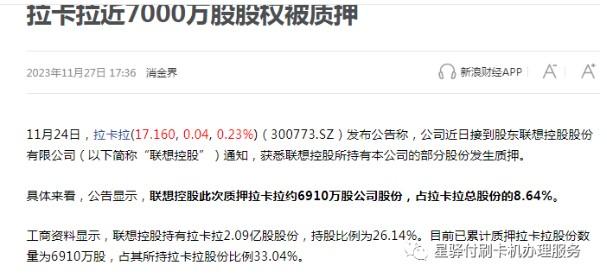 11月24日,拉卡拉發(fā)布公告稱,公司近日接到股東聯(lián)想控股股份有限公司(以下簡稱“聯(lián)想控股”)通知,獲悉聯(lián)想控股所持有本公司的部分股份發(fā)生質(zhì)押。