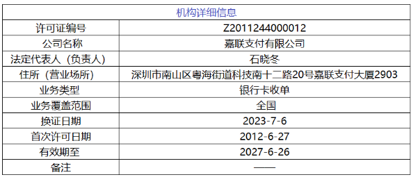 嘉聯(lián)支付成立于2009年5月,曾用名廣東嘉聯(lián)支付技術(shù)有限公司,2012年6月獲得央行頒發(fā)的《支付業(yè)務(wù)許可證》,擁有全國性銀行卡收單資質(zhì)!2022年6月嘉聯(lián)支付被中止支付牌照續(xù)展,一年后也就是今年的7月,嘉聯(lián)支付成功續(xù)展,也成為首批中止后成功續(xù)展的支付機(jī)構(gòu)!