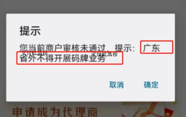 某手機POS為了合規(guī)在新增商戶時提示:“您當前商戶審核未通過,提示:廣東省外不得開展碼牌業(yè)務(wù)”。
