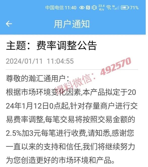 有網(wǎng)友爆出瀚匯通費(fèi)率調(diào)整,從2024年1月12日0點(diǎn)起,針對(duì)存量商戶費(fèi)率上調(diào)至2.5%+3,刷1萬元手續(xù)費(fèi)高達(dá)253元。