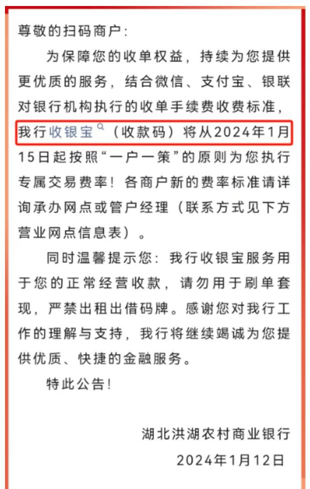 近日,有客戶收到短信:尊敬的農(nóng)商行收銀寶客戶,我行將于2024年1月15日調(diào)整收銀寶商戶手續(xù)費(fèi)收費(fèi)標(biāo)準(zhǔn),您在我行收款碼將按照交易額度2.5%收取手續(xù)費(fèi)。