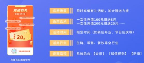 儲值有禮階梯型儲值贈送規(guī)則,滿足不同顧客消費需求;會員預(yù)存金額增加店鋪流動資金同時,提高會員忠誠度。