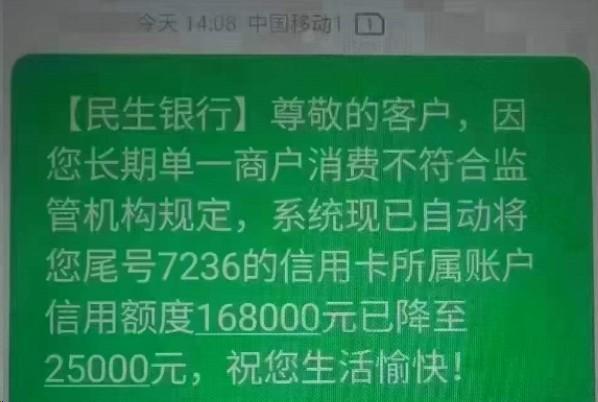 民生銀行,持卡人長期單一商戶消費不符合監(jiān)管機構(gòu)規(guī)定,16萬額度將至2萬多。