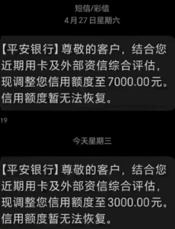 平安銀行,持卡人信用卡由于近期用卡及外部資信綜合評估原因,額度在不到一個月的時間內(nèi),被連續(xù)兩次降額。