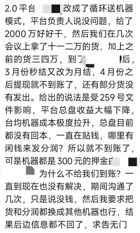 某2.0平臺(tái)分潤代理商提現(xiàn)不到賬,平臺(tái)負(fù)責(zé)人直接玩消失!據(jù)代理商描述:自2024年4月起到現(xiàn)在,代理的分潤提現(xiàn)一直都無法到賬。代理商自己前后拿貨約十五六萬。拿了十幾萬的貨,幾萬的分潤,一毛錢都沒拿到。