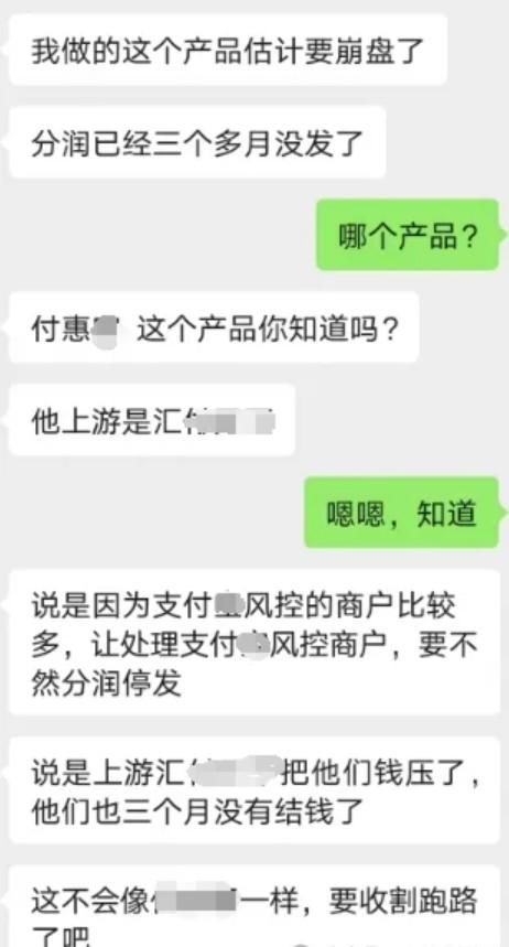 聚合碼牌產(chǎn)品付惠B分潤三個(gè)月沒發(fā),提現(xiàn)不到賬!據(jù)爆料人描述:上級(jí)說因?yàn)轱L(fēng)控商戶比較多,讓處理風(fēng)控商戶,要不然分潤停發(fā),說是上游支付公司已經(jīng)扣壓了三個(gè)月分潤。