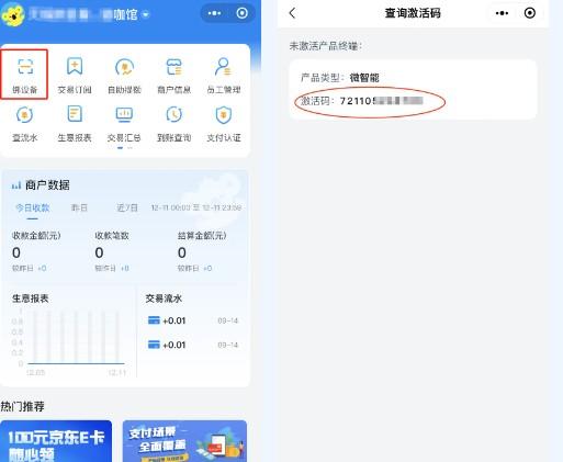 商戶在申請材料提交后進(jìn)入審核階段,會直接進(jìn)入下一步,輸入身份證后六位,進(jìn)入查詢界面。如果已經(jīng)關(guān)閉鏈接,用微信或者支付寶掃開通的二維碼再次進(jìn)入即可。若審核失敗,請按照注冊頁面提示進(jìn)行修改或咨詢辦理人員核實(shí)。注意:第一次登陸需要驗(yàn)證手機(jī)號,授權(quán)手機(jī)號進(jìn)行登陸“拉卡拉”小程序,頁面頂部出現(xiàn)開通的商戶名字后,即可正常使用;點(diǎn)擊綁設(shè)備—查詢激活碼