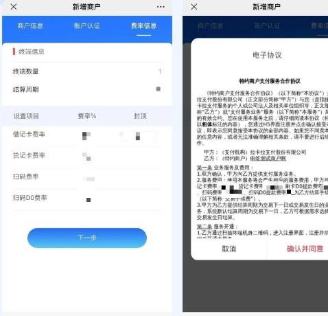 第三步:確認(rèn)費(fèi)率(無法修改),同意并簽署商戶電子協(xié)議提交審核,簽名盡量正楷,提交后等待審核通過,一般都是秒審核。