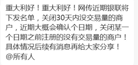 之前確實有消息傳出銀聯(lián)將下發(fā)名單,清理并關(guān)閉30個自然日內(nèi)沒交易量的商戶。但是有個“截止日期”作為此次清理行動的時間界限。所有在“截止日期”之前注冊成立,但在隨后連續(xù)30個自然日內(nèi)未記錄任何交易活動的商戶,均將納入此次清理范圍,面臨賬戶關(guān)閉的處理決定。