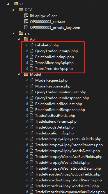 拉卡拉開放平臺的接口包含兩種風(fēng)格,部分接口風(fēng)格為V2(駝峰)、部分接口風(fēng)格為V3(下劃線,基于openAPI規(guī)范),為此,PHPSDK封裝了V2、V3兩種接口的API,開發(fā)者可以根據(jù)所使用接口的風(fēng)格選擇不同API類。