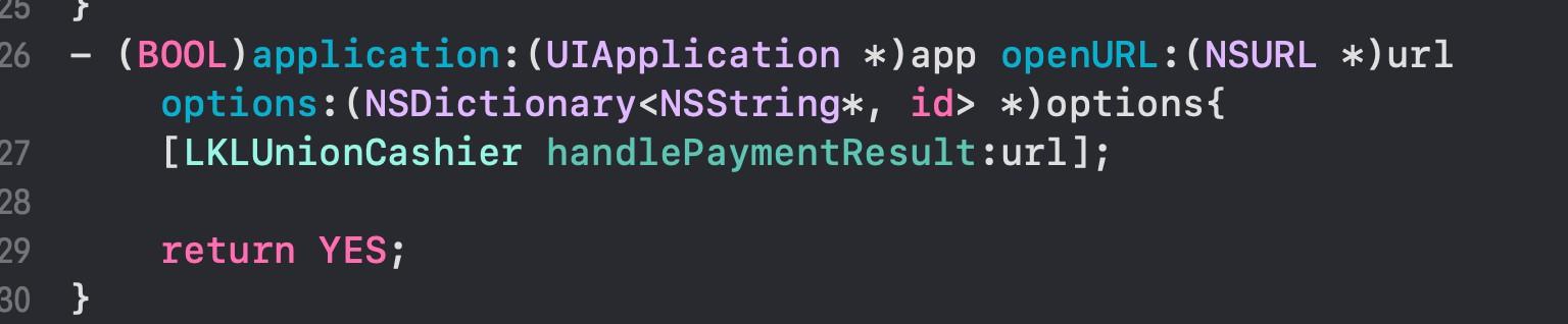 Appdelegate的openURL將支付結(jié)果url(如果之前有其他平臺,要區(qū)分開),傳給LKLUnionCashier