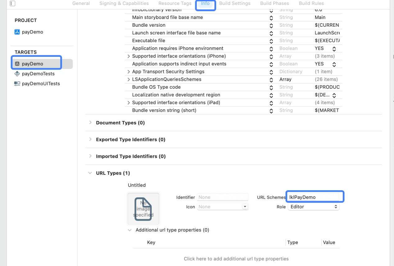 info.plist設(shè)置中添加一個URL Types回調(diào)協(xié)議,用于在支付完成后返回商戶客戶端。請注意URL Schemes需要是唯一的,與app對應(yīng)。